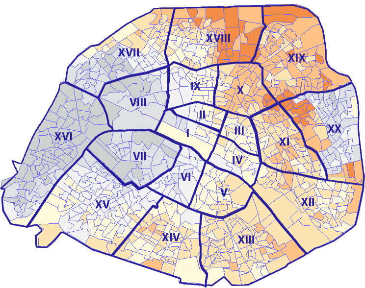 Survolez chaque arrondissement pour voir les résultats, et Cliquez dessus pour le détail