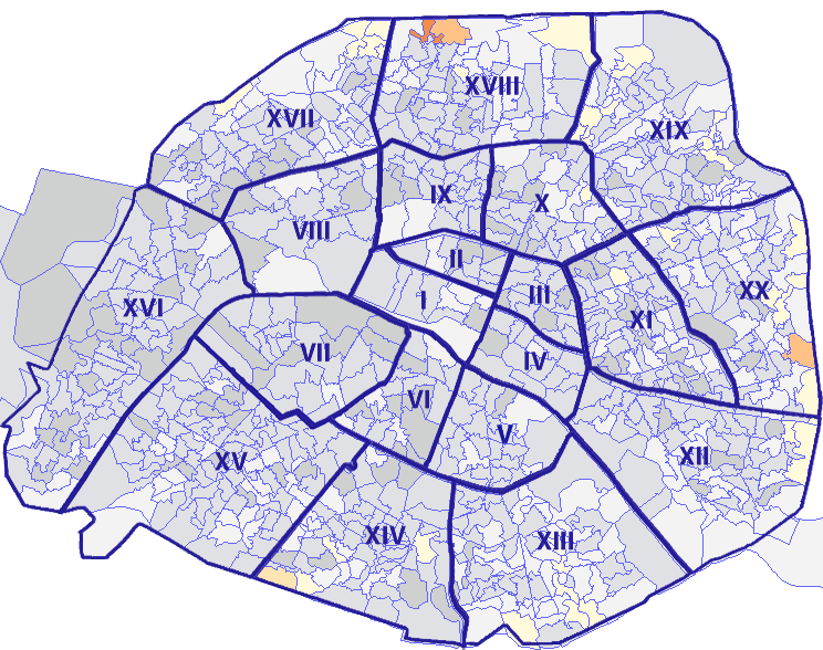 Survolez chaque arrondissement pour voir les résultats, et Cliquez dessus pour le détail
