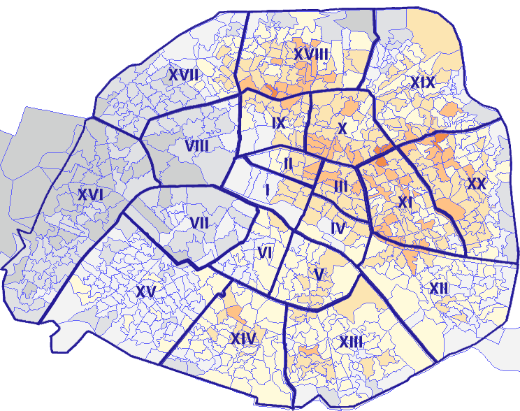 Survolez chaque arrondissement pour voir les résultats, et Cliquez dessus pour le détail