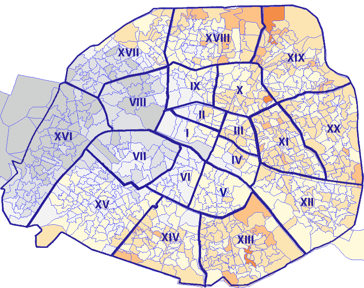Survolez chaque arrondissement pour voir les résultats, et Cliquez dessus pour le détail