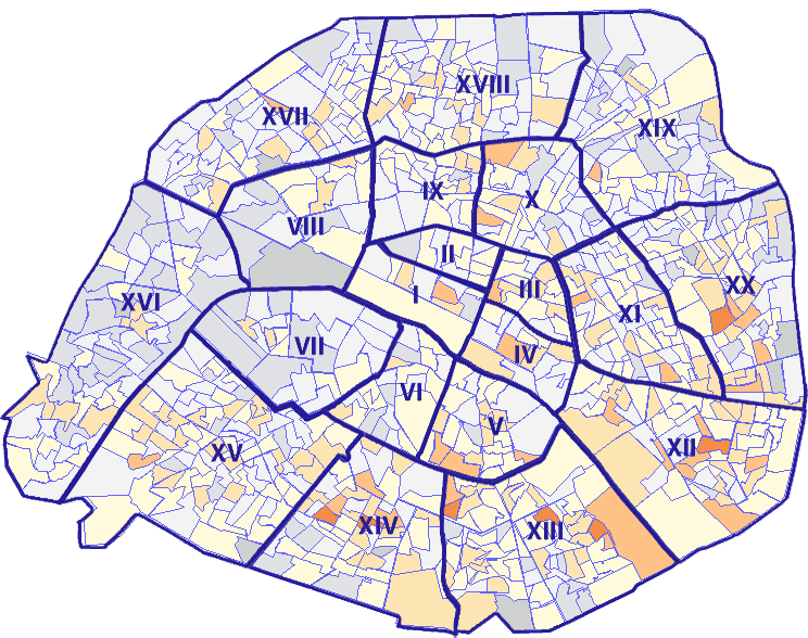 Survolez chaque arrondissement pour voir les résultats, et Cliquez dessus pour le détail