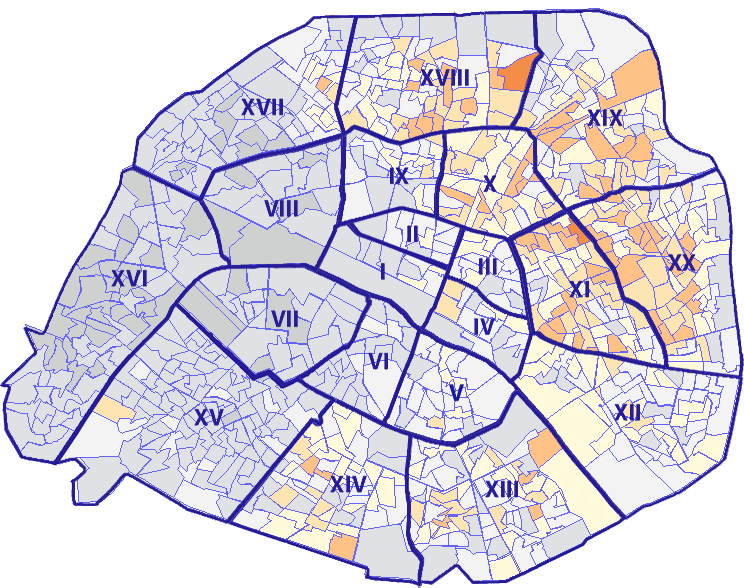 Survolez chaque arrondissement pour voir les résultats, et Cliquez dessus pour le détail
