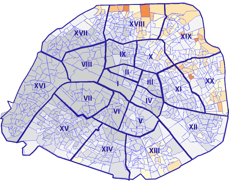 Survolez chaque arrondissement pour voir les résultats, et Cliquez dessus pour le détail