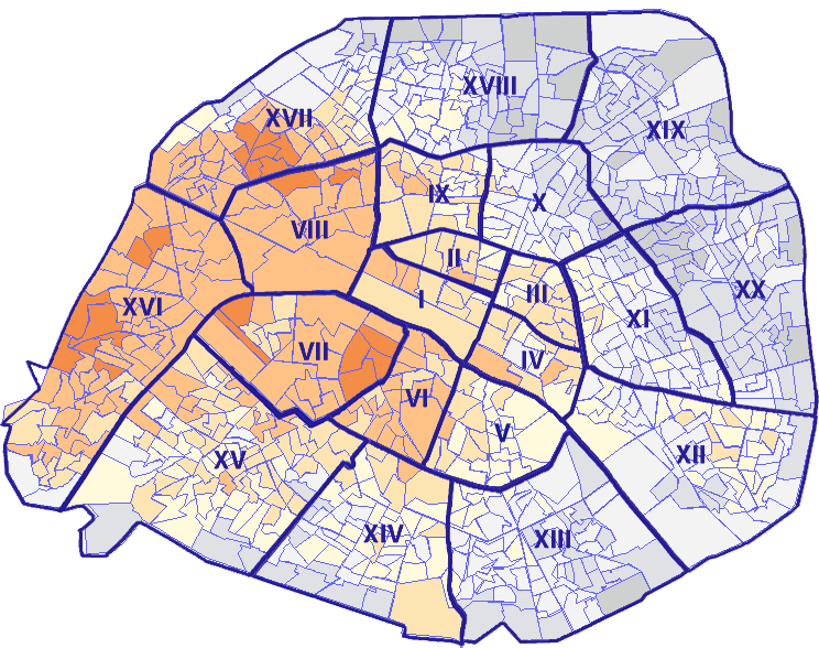 Survolez chaque arrondissement pour voir les résultats, et Cliquez dessus pour le détail