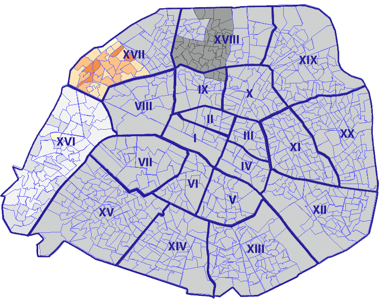 Survolez chaque arrondissement pour voir les résultats, et Cliquez dessus pour le détail