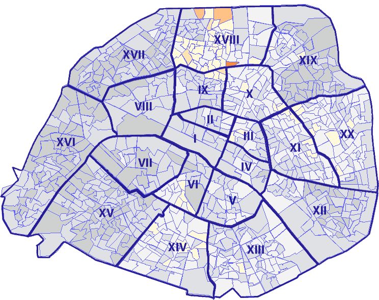 Survolez chaque arrondissement pour voir les résultats, et Cliquez dessus pour le détail