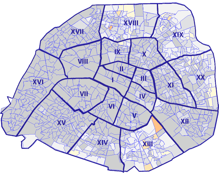 Survolez chaque arrondissement pour voir les résultats, et Cliquez dessus pour le détail
