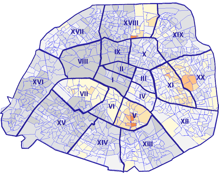 Survolez chaque arrondissement pour voir les résultats, et Cliquez dessus pour le détail