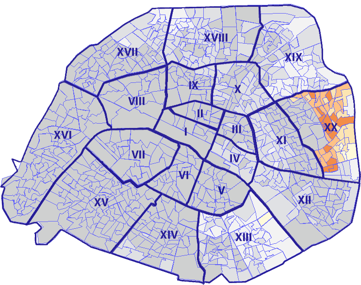 Survolez chaque arrondissement pour voir les résultats, et Cliquez dessus pour le détail