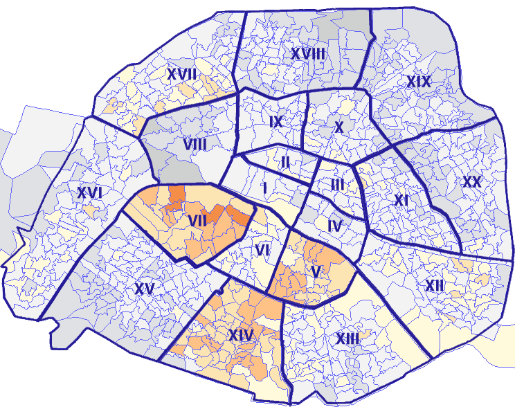 Survolez chaque arrondissement pour voir les résultats, et Cliquez dessus pour le détail