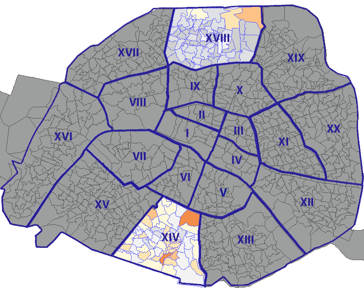 Survolez chaque arrondissement pour voir les résultats, et Cliquez dessus pour le détail