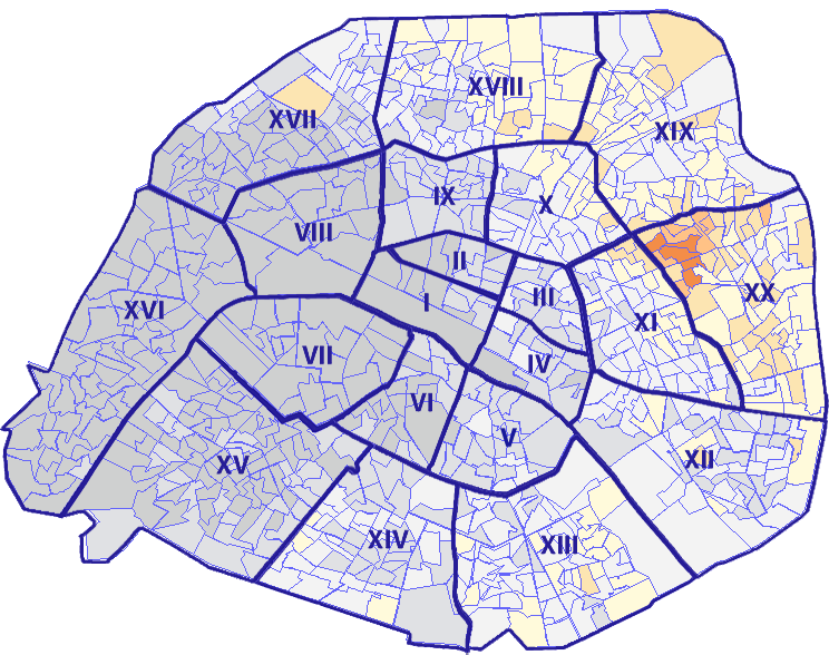 Survolez chaque arrondissement pour voir les résultats, et Cliquez dessus pour le détail