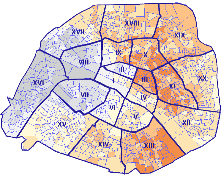 Survolez chaque arrondissement pour voir les résultats, et Cliquez dessus pour le détail