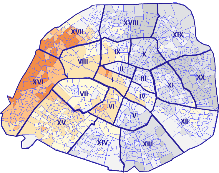Survolez chaque arrondissement pour voir les résultats, et Cliquez dessus pour le détail
