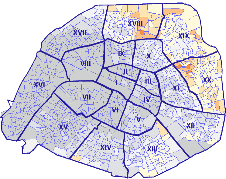 Survolez chaque arrondissement pour voir les résultats, et Cliquez dessus pour le détail