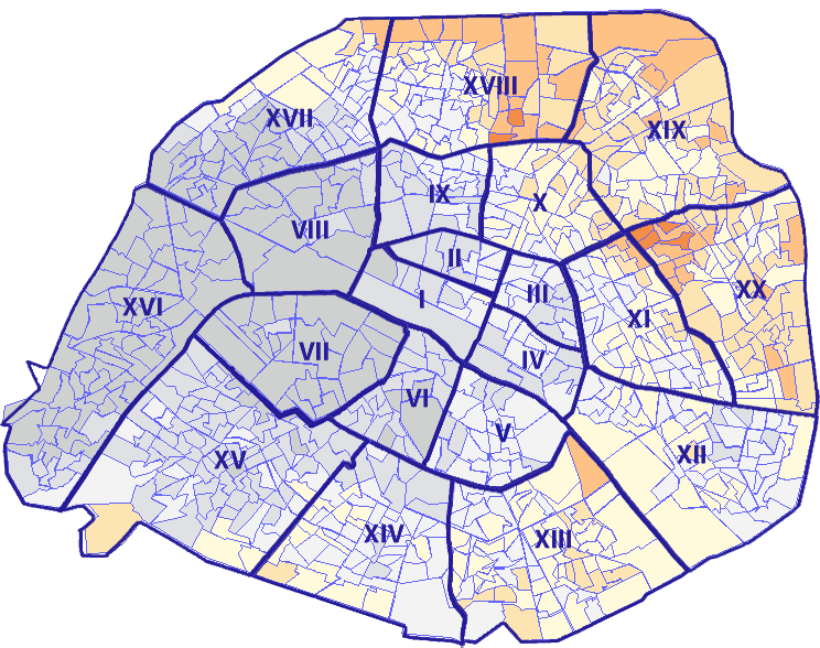 Survolez chaque arrondissement pour voir les résultats, et Cliquez dessus pour le détail