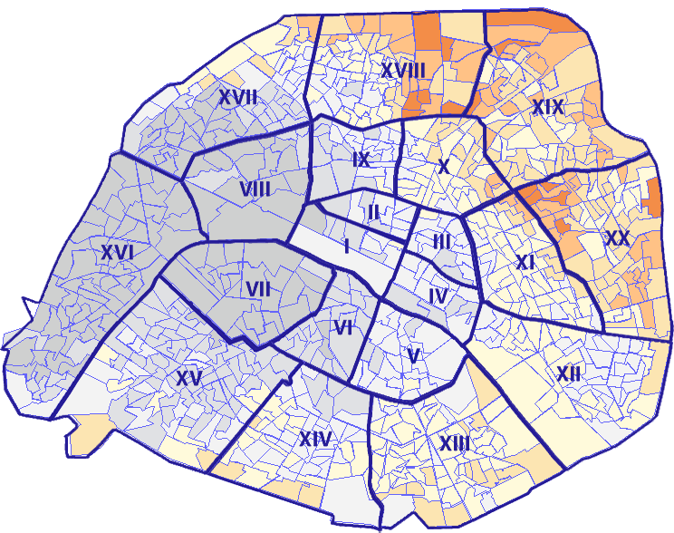 Survolez chaque arrondissement pour voir les résultats, et Cliquez dessus pour le détail