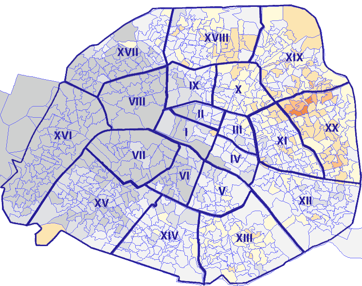 Survolez chaque arrondissement pour voir les résultats, et Cliquez dessus pour le détail