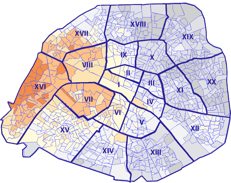 Survolez chaque arrondissement pour voir les résultats, et Cliquez dessus pour le détail