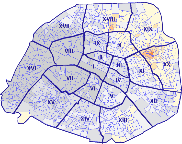 Survolez chaque arrondissement pour voir les résultats, et Cliquez dessus pour le détail