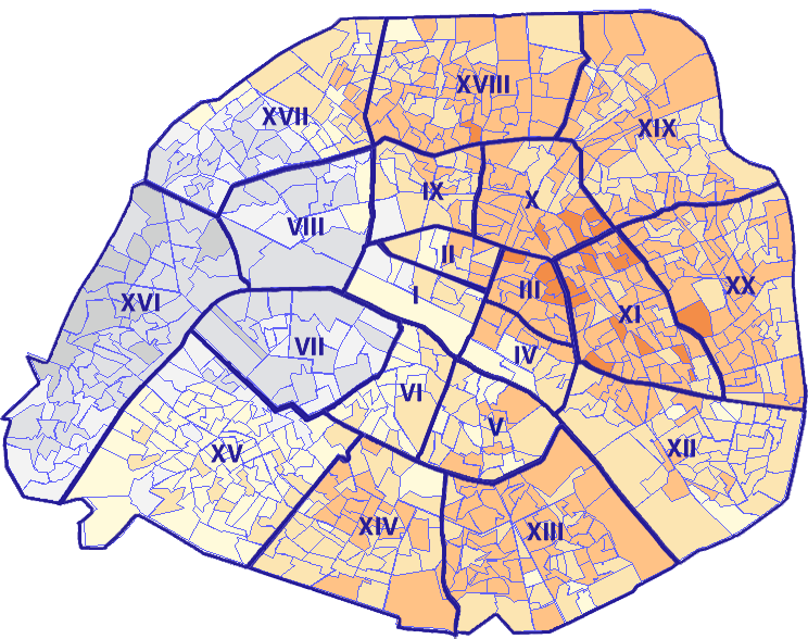 Survolez chaque arrondissement pour voir les résultats, et Cliquez dessus pour le détail