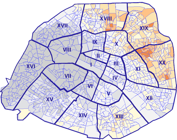 Survolez chaque arrondissement pour voir les résultats, et Cliquez dessus pour le détail