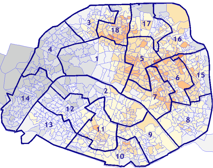 Survolez chaque arrondissement pour voir les résultats, et Cliquez dessus pour le détail