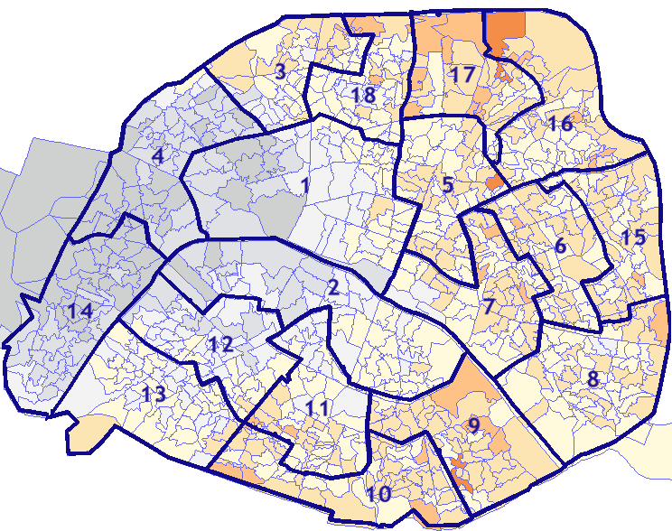 Survolez chaque arrondissement pour voir les résultats, et Cliquez dessus pour le détail