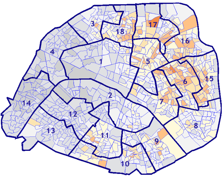 Survolez chaque arrondissement pour voir les résultats, et Cliquez dessus pour le détail