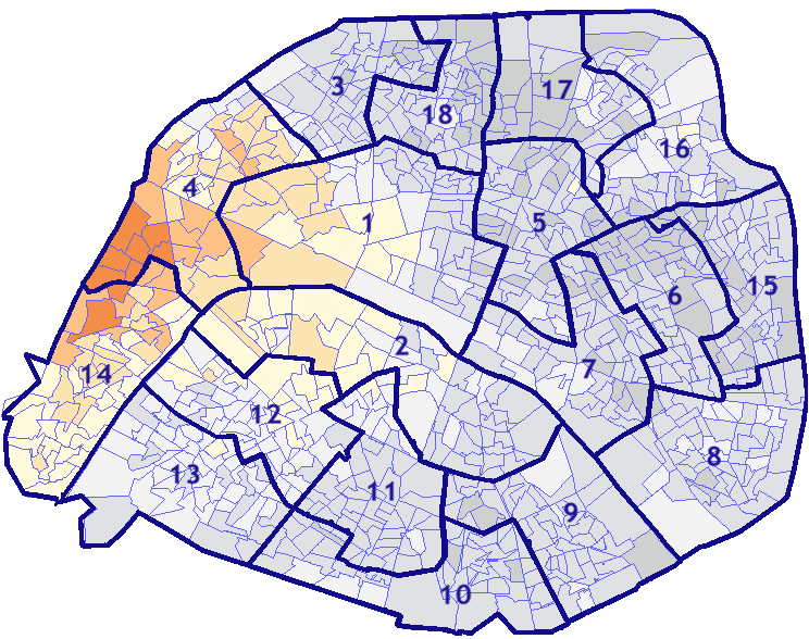 Survolez chaque arrondissement pour voir les résultats, et Cliquez dessus pour le détail