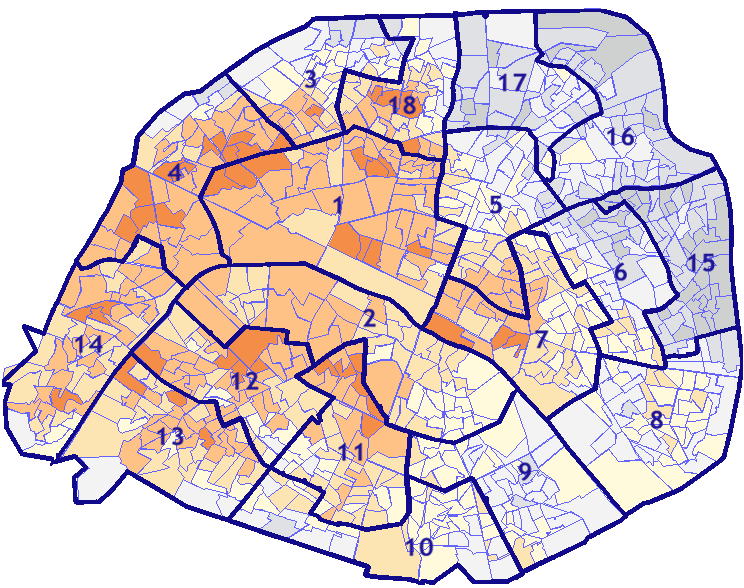Survolez chaque arrondissement pour voir les résultats, et Cliquez dessus pour le détail
