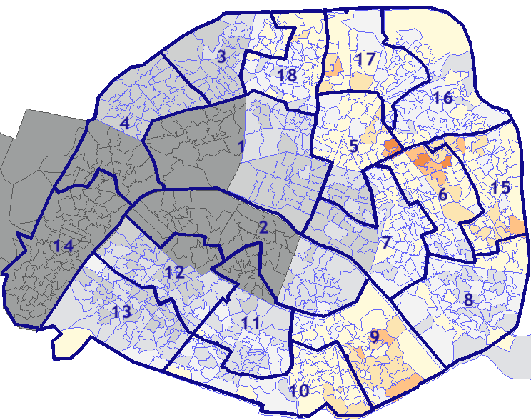 Survolez chaque arrondissement pour voir les résultats, et Cliquez dessus pour le détail