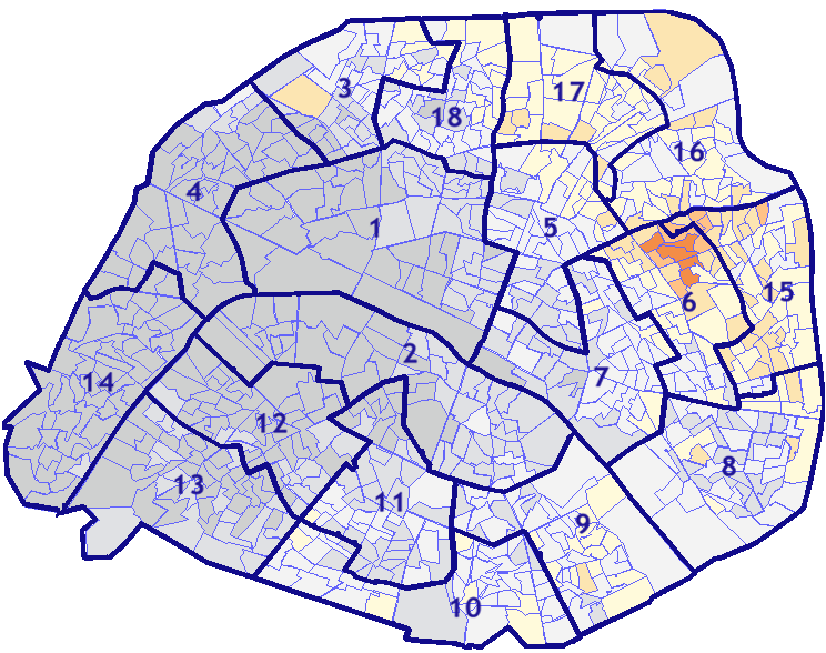 Survolez chaque arrondissement pour voir les résultats, et Cliquez dessus pour le détail