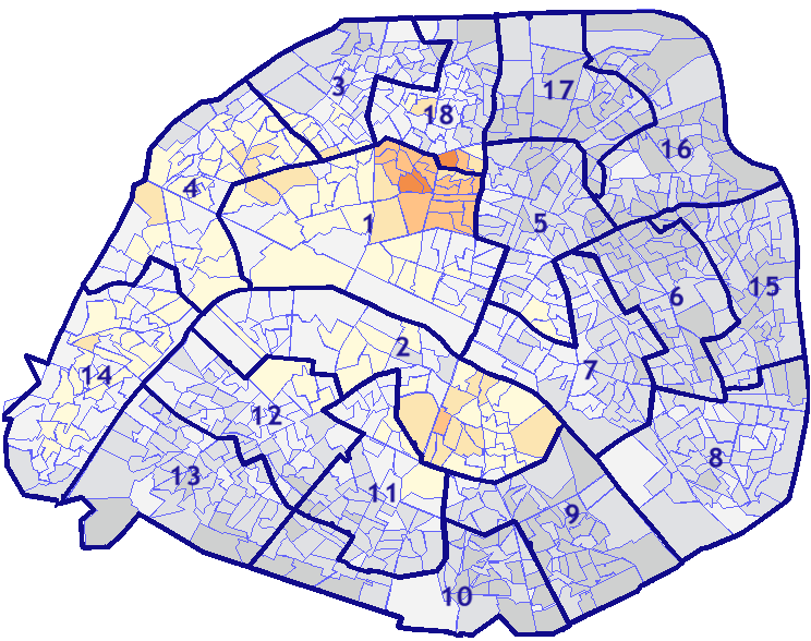 Survolez chaque arrondissement pour voir les résultats, et Cliquez dessus pour le détail