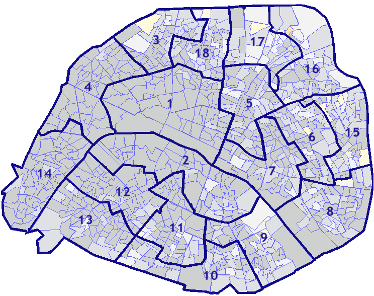 Survolez chaque arrondissement pour voir les résultats, et Cliquez dessus pour le détail