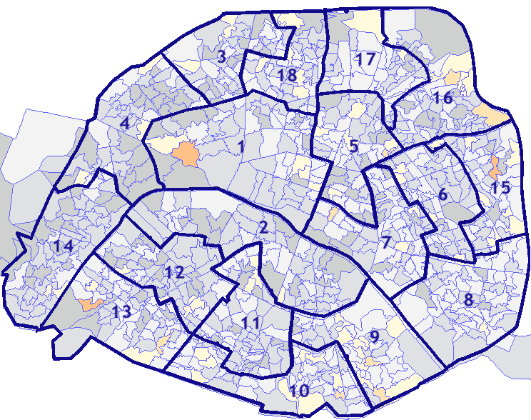 Survolez chaque arrondissement pour voir les résultats, et Cliquez dessus pour le détail