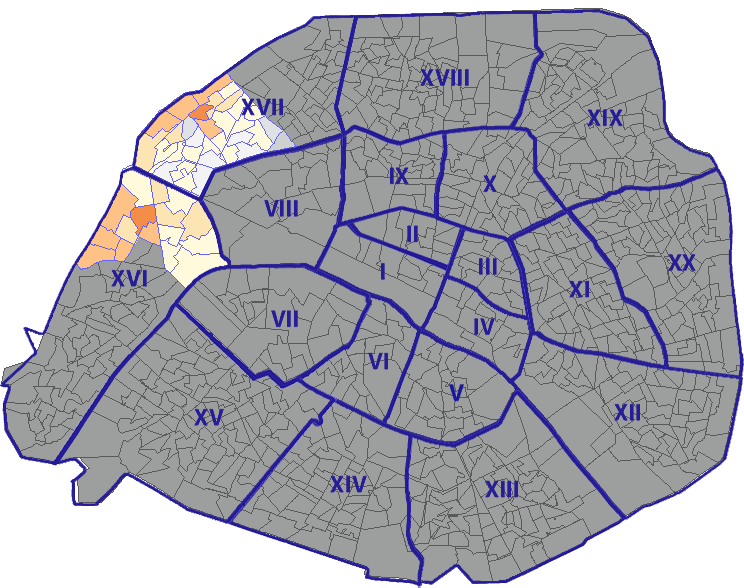 Survolez chaque arrondissement pour voir les résultats, et Cliquez dessus pour le détail