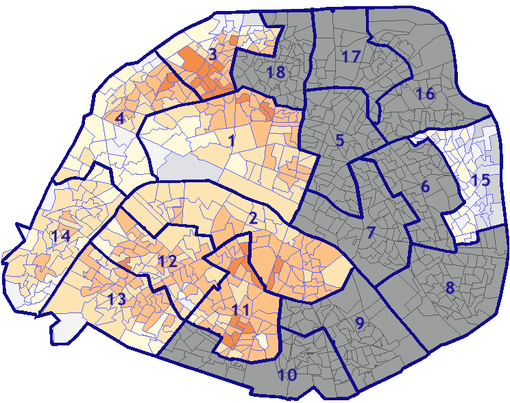 Survolez chaque arrondissement pour voir les résultats, et Cliquez dessus pour le détail